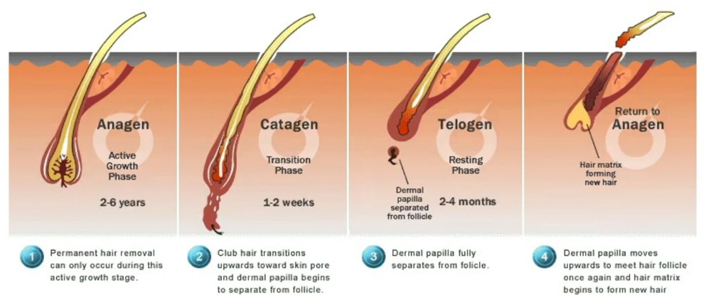 Οι τέσσερις φάσεις ανάπτυξης των μαλλιών περιλαμβάνουν την αναγενή, την καταγενή, την τελογενή και την εξωγενή. Κάθε φάση διαρκεί διαφορετικό χρονικό διάστημα.