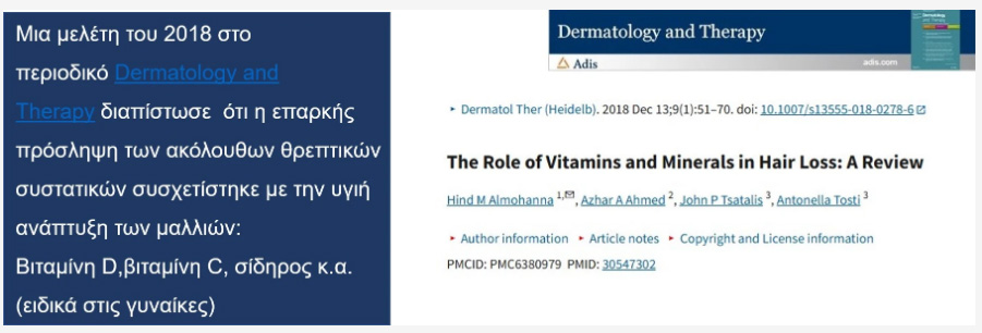Μια μελέτη του 2018 στο περιοδικό Dermatology and Therapy διαπίστωσε επίσης ότι η επαρκής πρόσληψη των ακόλουθων θρεπτικών συστατικών συσχετίστηκε με την υγιή ανάπτυξη των μαλλιών: βιταμίνη D,βιταμίνη C, σίδηρος (ειδικά στις γυναίκες)